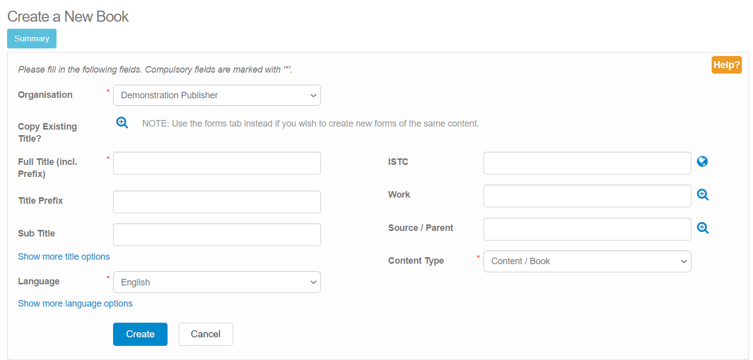 The title tab provides you with full details about the title you are editing or creating. When creating a new title, there will be no additional tabs added until you click the Create button (as per image below).