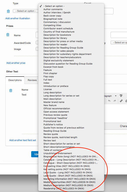 PLEASE NOTE THAT on the Stison system - all data from a title's record is set to go out in an ONIX feed UNLESS it specifically says 'not in onix' beside it. Here is a screenshot of items from the Blurbs Tab that wouldn't go out in an ONIX feed: