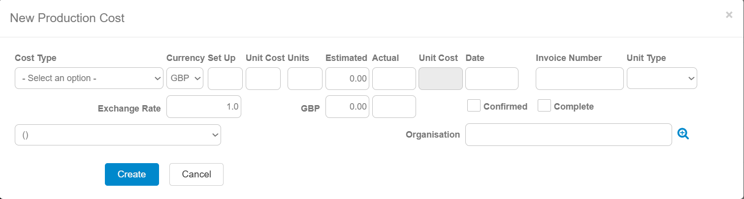 In order to start adding costs to the tab, click on the Add production cost button. You will then see a pop-up that looks like this: