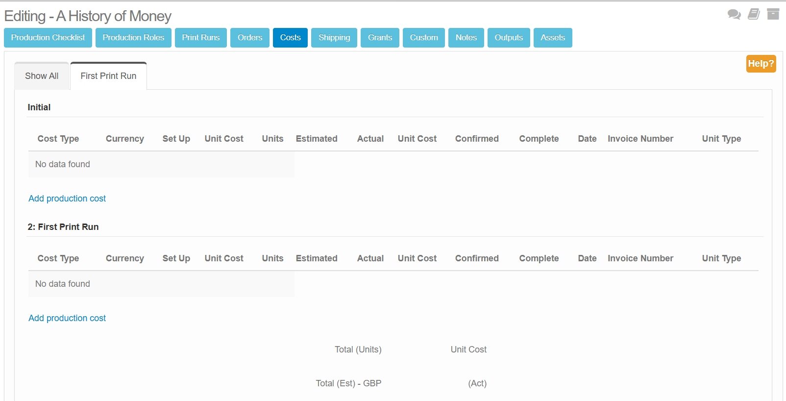 The Costs tab within Book Production looks like the following: