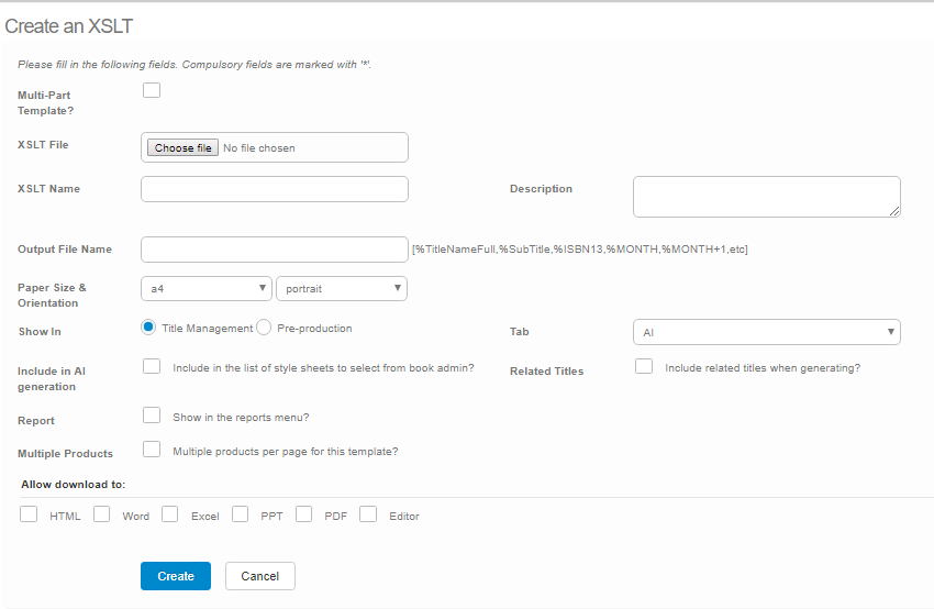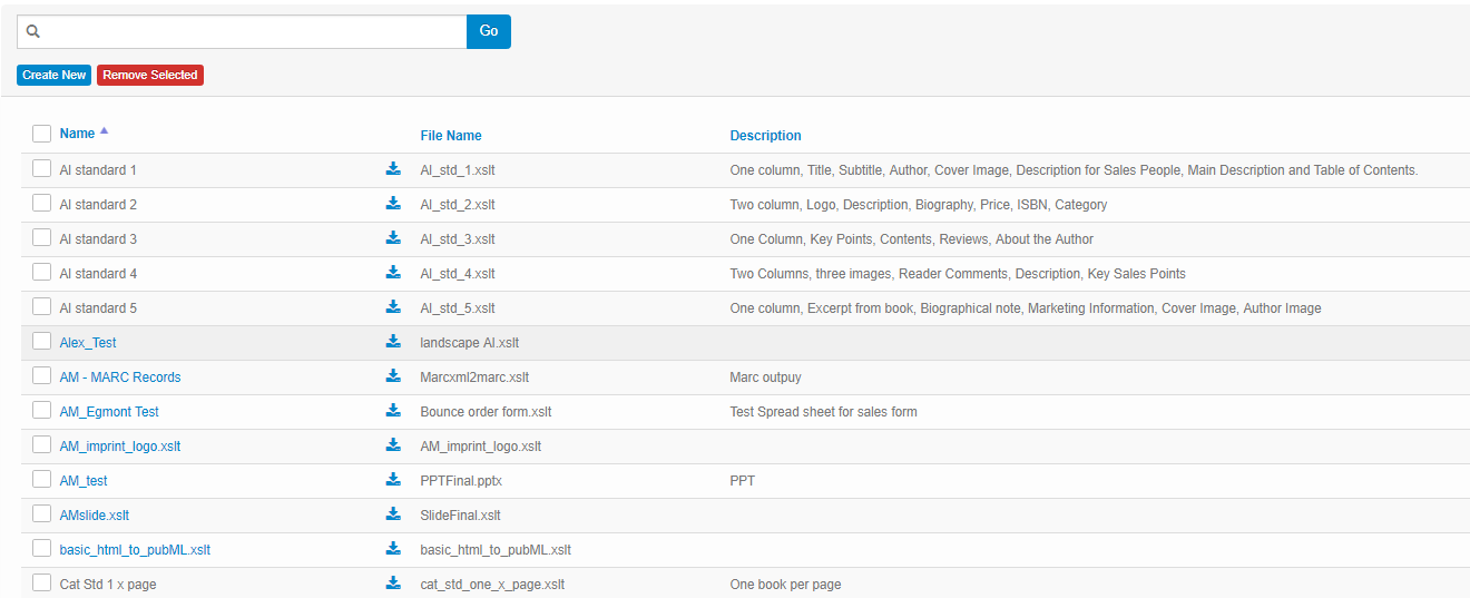 XSLT Admin is an area of the system that allows you to upload a set of templates for the files and reports you generate from your system - such as AIs, Order Forms and Catalogues. The information you want to pull out from the database: a CSV, XML or PDF, will be laid out as specified in the templates you upload. This process begins first by generating ONIX in long format and then passing the info to the XSLT template. The relevant data is then filtered and formatted by the template.