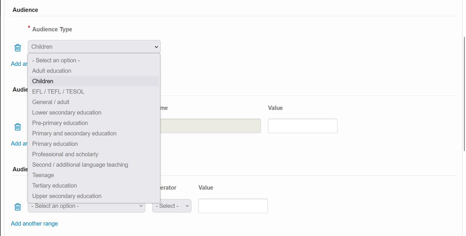 You will then need to determine the key Audience for the book. In the screenshot below, we have already clicked onto the drop-down menu that appears there. It's pretty typical to be using General/Adult or Children.