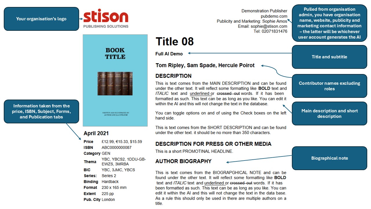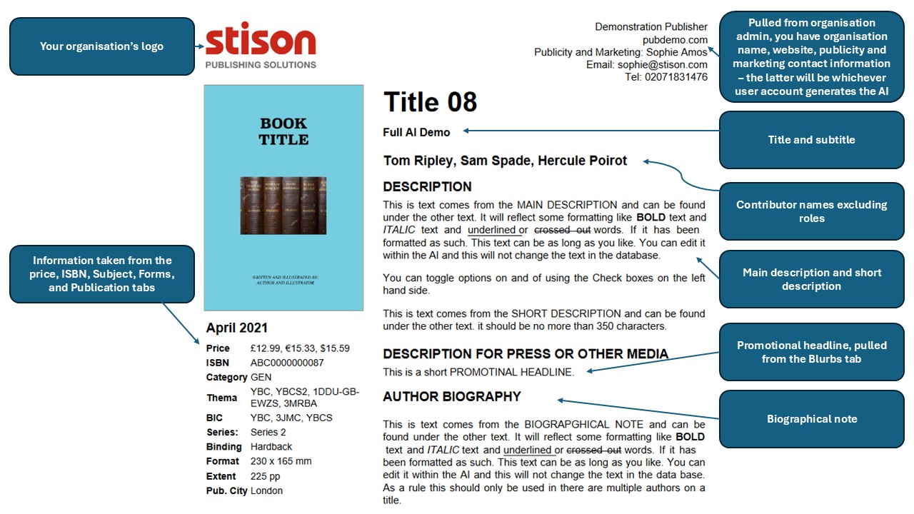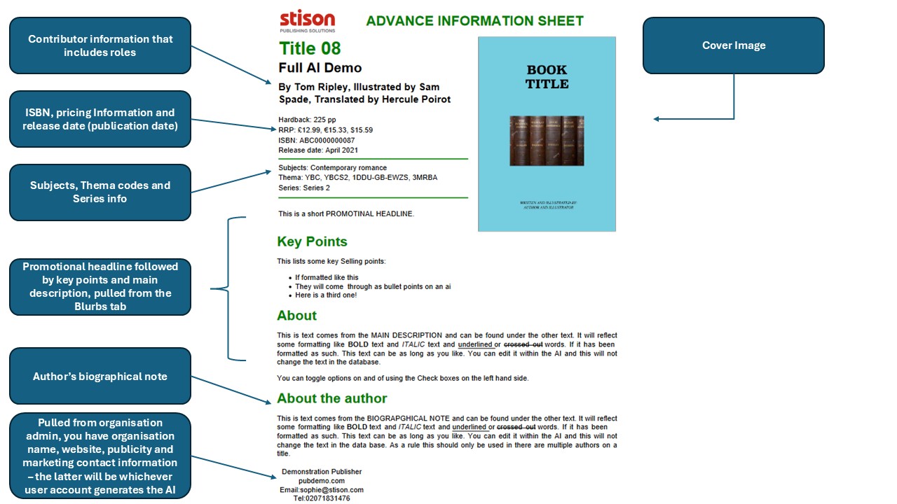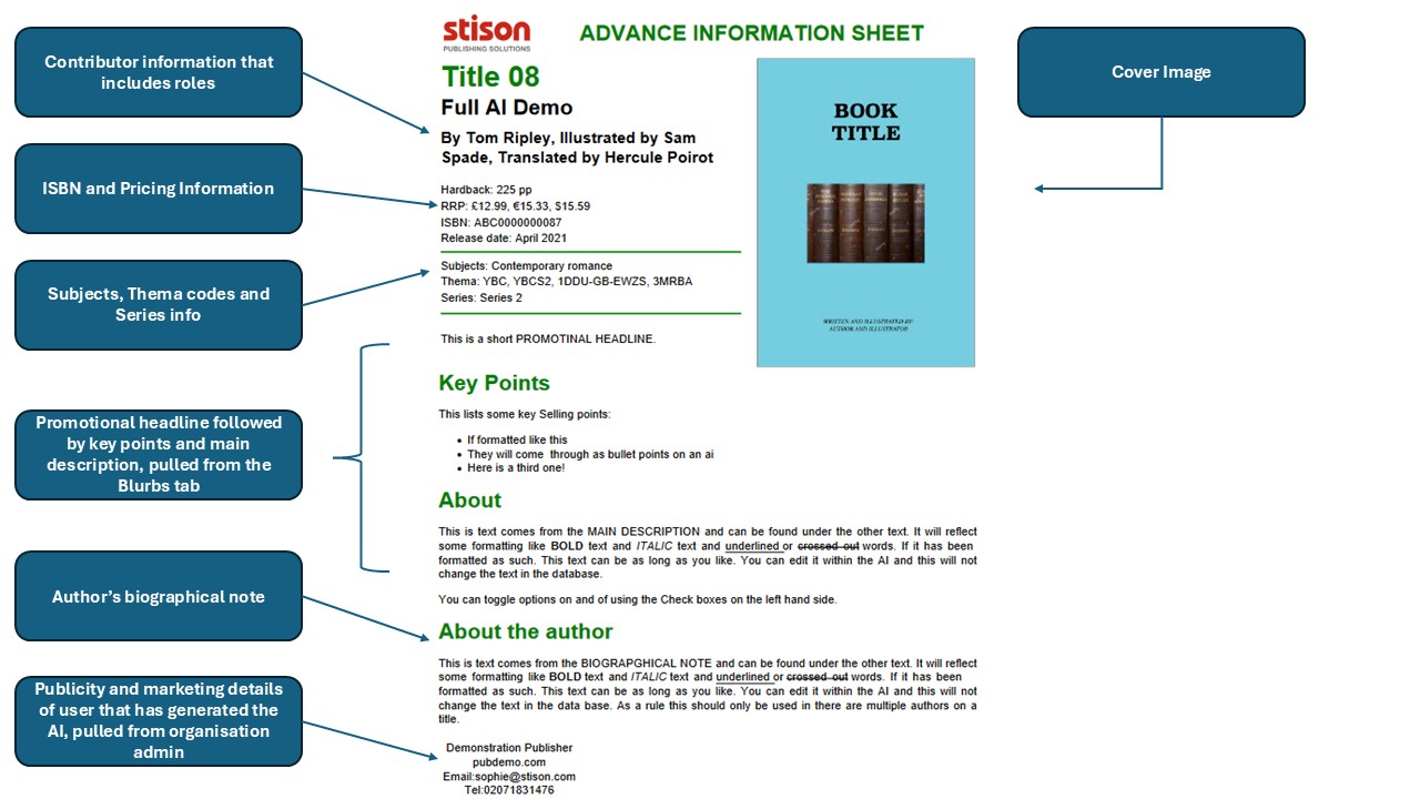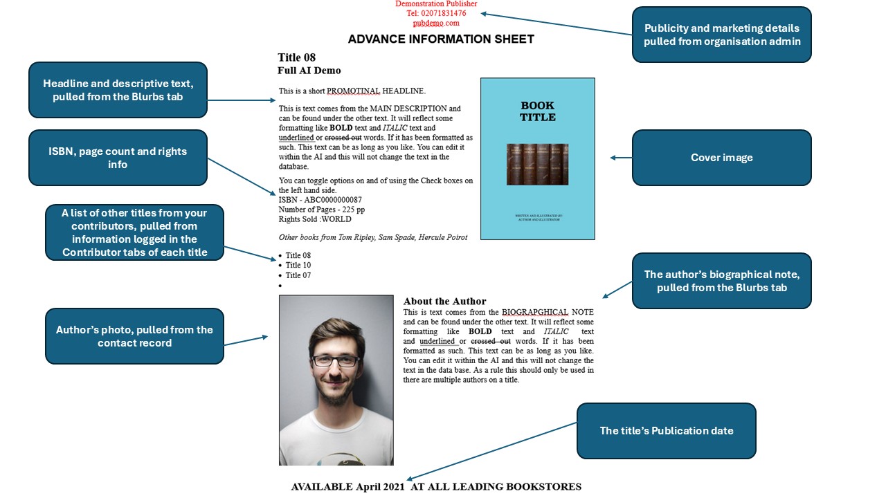 An Advanced Information sheet (AI) is a marketing document designed to promote forthcoming books to external partners in the industry, before their release. It includes essential information such as title and subtitle, contributor information, reviews, and so on.