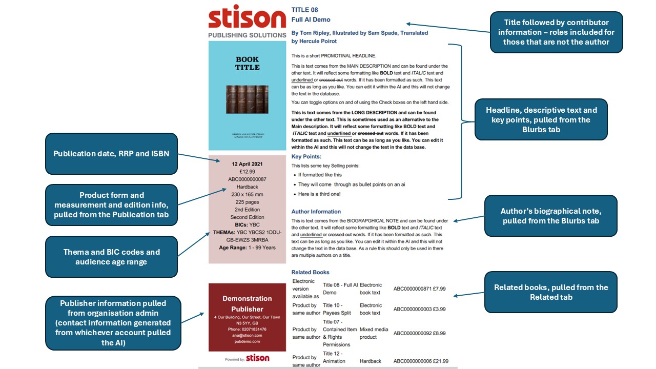 The functionality here is as good as the data behind it. That is to say that the generation of a complete Advanced Information sheet requires complete, rich metadata in your title record.