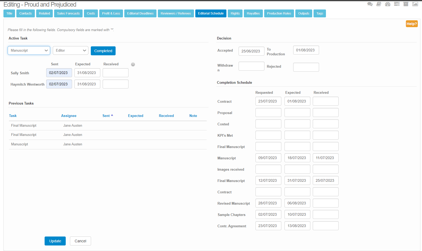 The Editorial Completion Schedule tab provides more ways for you to track and update Editorial tasks and deadlines. This tab was designed to record milestones that needed to be hit before a book could enter the production process, and provides options to assign tasks by role or type.