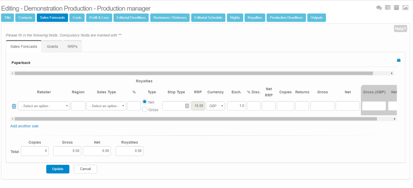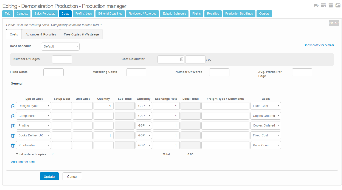 - Free Copies and Wastage: allows you to fill in the number of free copies you are planning to give away and the anticipated wastage.