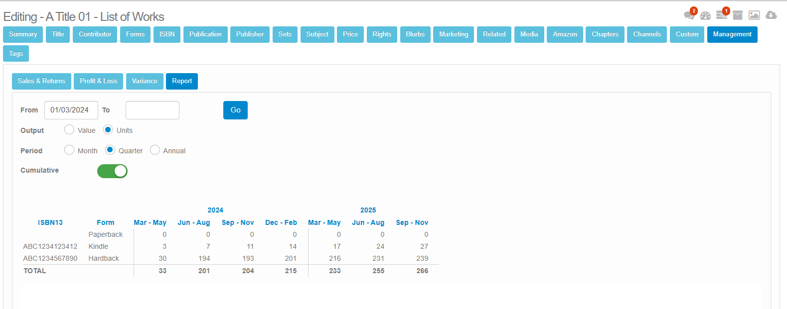 The Management Tab is where you can get an overview of the financial performance of your title. Each sub-tab contains a different report that pulls information from across the Stison system, such as Editorial and Sales/Royalties, into one place so that you can quickly see how profitable a title has been.