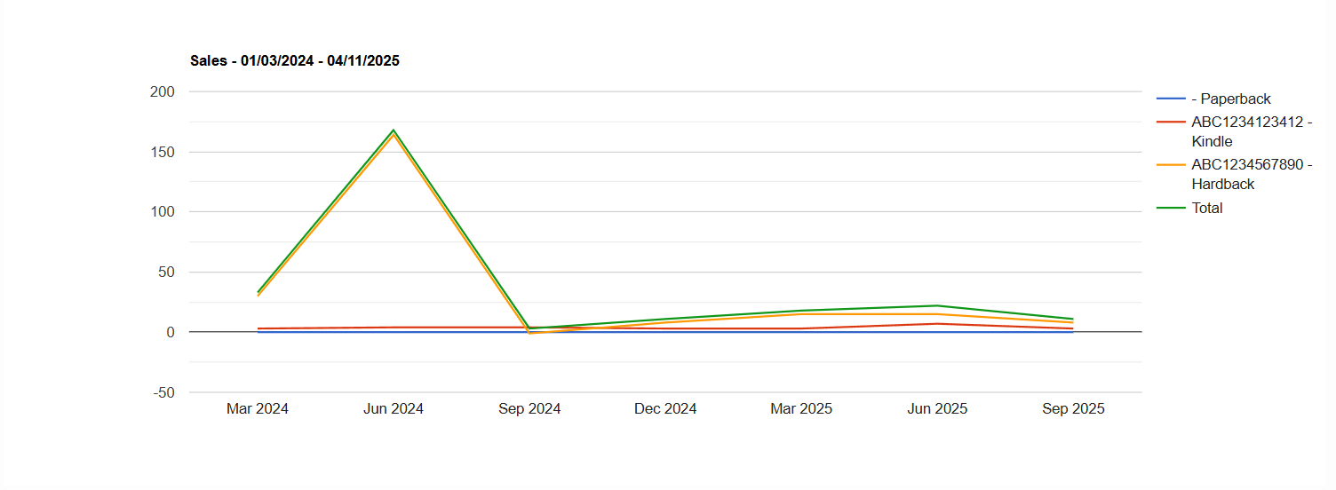 The final sub-tab is a sales report for your title. Here, you can view all of the sales made of this particular title within a specified date range. You can also choose whether you would like the output to reflect the value accrued or the units sold, as well as whether you would like to review the report on a monthly, quarterly, or annual basis.