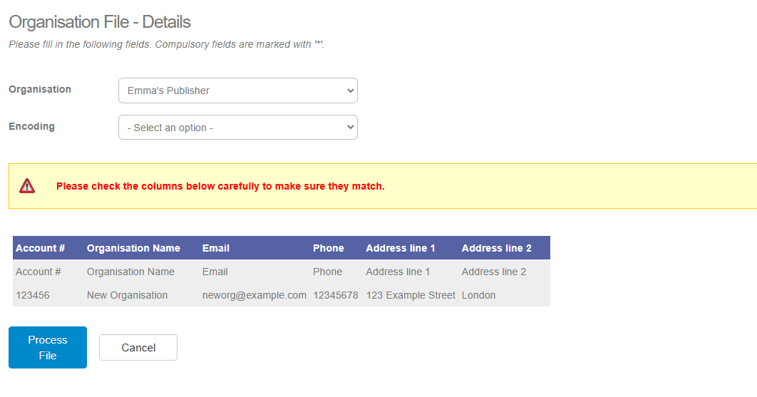 7. Once you are sure that your column mapping is accurate, select the blue Process File button. The system will then complete the upload.