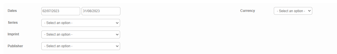 Firstly, set the Dates in which you would like your reports to be generated from. You also have the option to generate reports by selecting specific criteria such as Series, Imprint, Publisher, and Currency from the drop-down menus. These selections will streamline the data included in your report/s.