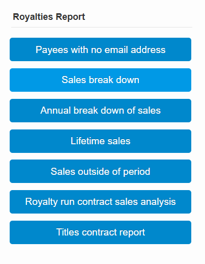 Sales break down: A breakdown of your titles' sales over a specified time period - can be viewed monthly, quarterly, bi-annually or annually. This report can be exported as a CSV file.