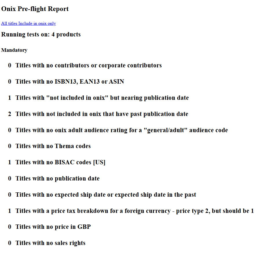 By selecting this option from the Report dropdown menu, you can view a Pre-flight report on a regular basis. This report will scan all of the titles that you have set to be included in your ONIX feeds and will email you the results.