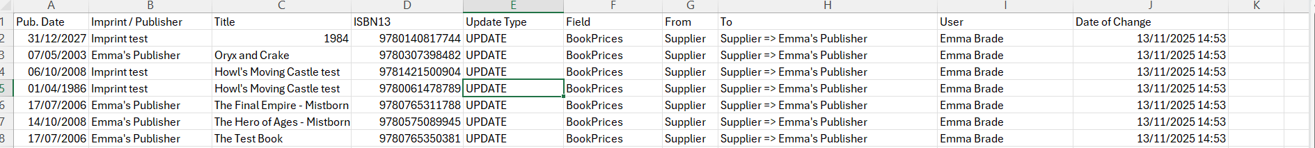 This is a list of all of the changes that have been made to titles in your system. By default, this report will show all of the changes that have been within the last week on the system. The report will be sent as a downloadable Excel file, which will be formatted like the following: