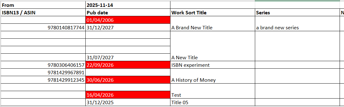 This produces a list of all titles that are yet to be published as of the date that the report was run. This report is an automated version of the Pub Schedule report that can be accessed from the main Reports menu, and will be sent as a downloadable Excel file that shows the ISBN, Pub date, Work Sort Title, Series, No. in Series, Author, Imprint, Binding (format), UK List Price, EU List Price, US List Price, and the Main Description.