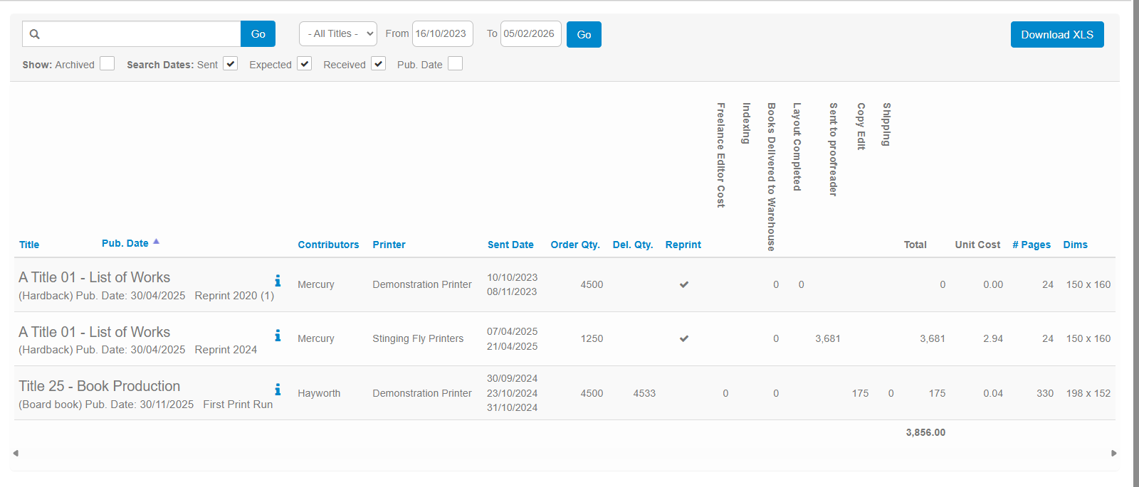 Here you can view all of the costs entere across the titles that you currently have in production. You can choose whether this date range encompasses printer sent, expected and received dates, as well as publication dates.