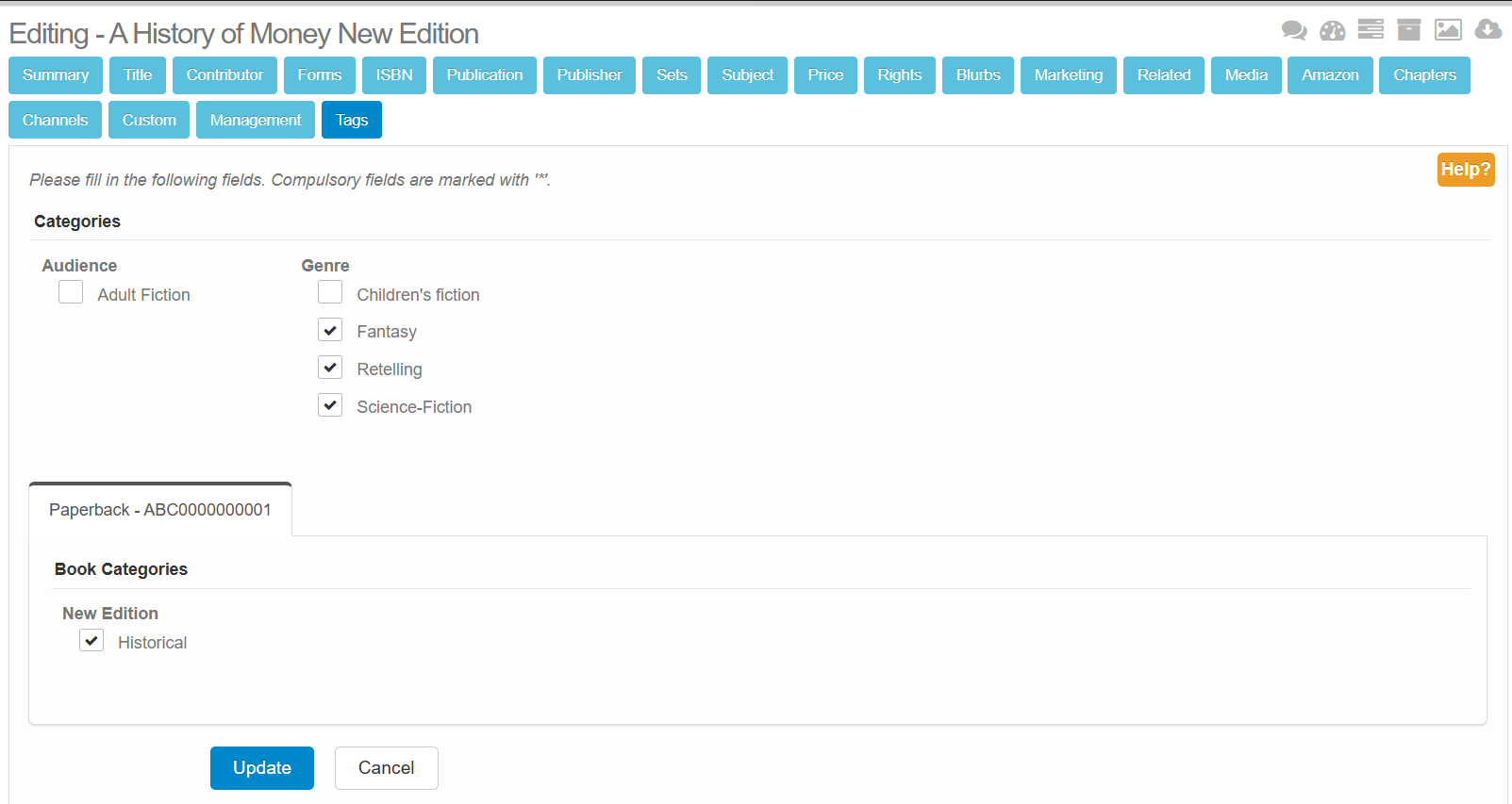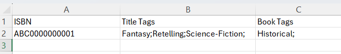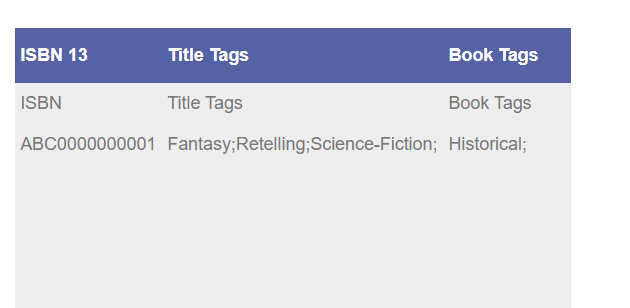 - Book Tags - these tags appear at the product form level, meaning that each tag uploaded will only apply to the corresponding ISBN/identifier.