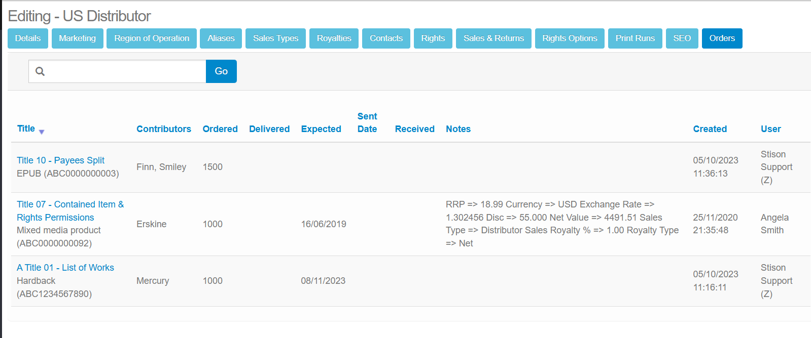 If you have recorded information about orders this organisation has made for a certain titles on the Orders tab in Production, you will be able to view that information here.