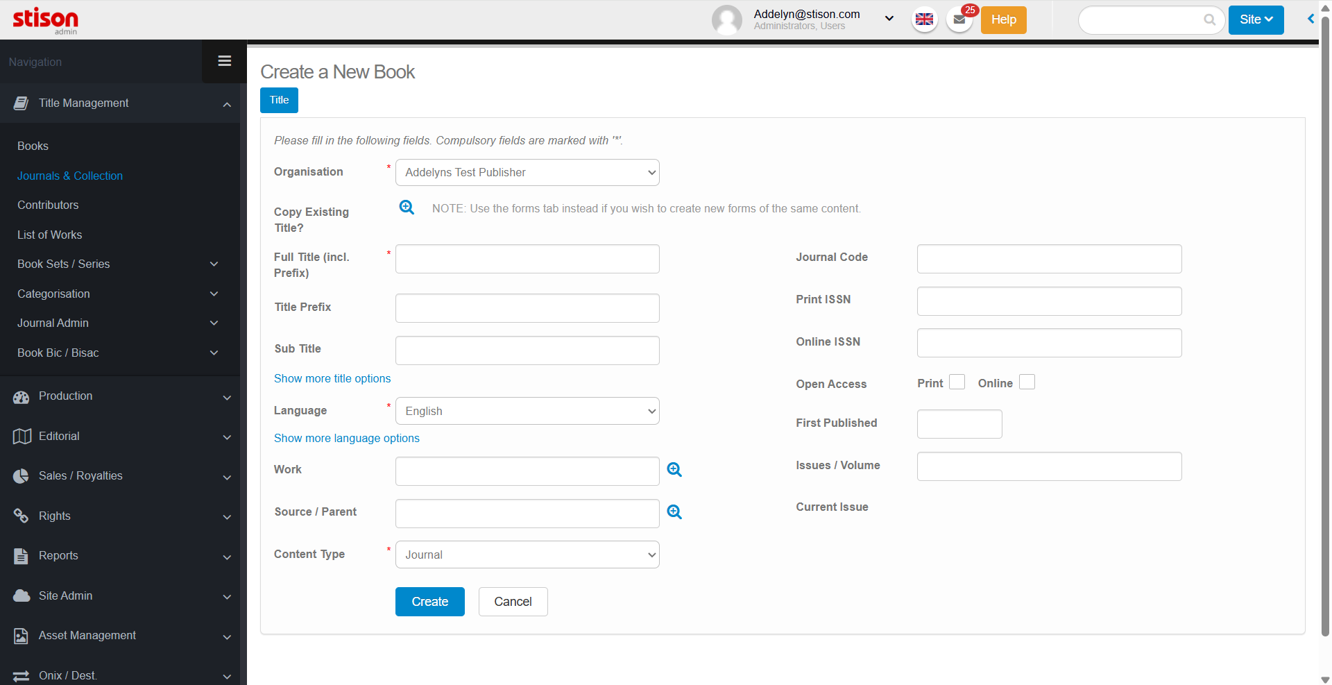 Note: The language will have automatically populated based on the default language of your system. Content Type will also have populated as journal.