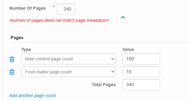 You can find further details about each of these extent types in Onix code list 23: https://ns.editeur.org/onix/en/23 You can view both of these extent types by selecting the down arrow next to number of pages, as shown in the screenshot below. If you have simply entered one number in “number of pages”, this number will also be copied into “main content page count” upon pressing “Update”. If you would like to specify further page extents, such as “front page matter” for example, the system will automatically add this to the "main content page count" value to calculate the "total pages". If you edit this information manually and the page extents do not add up to the total number, an error message will be displayed when attempting to save the data, as shown below. The same process will occur when bulk updating this information.