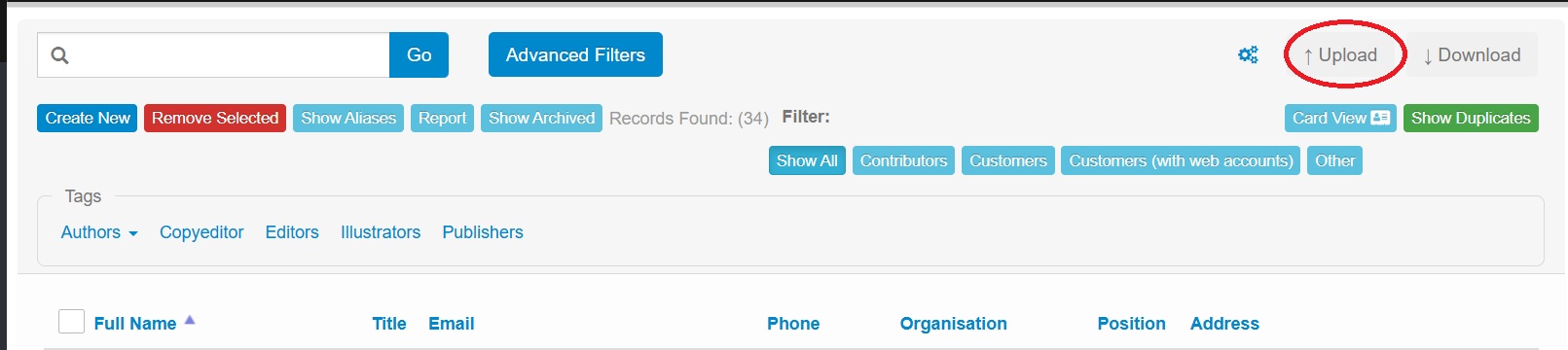 Both of the contacts main page and the organisation admin page allow you to upload contact information in bulk. This is done by pressing the "Upload" button in the top right hand corner and choosing the relevant file from your computer when prompted.