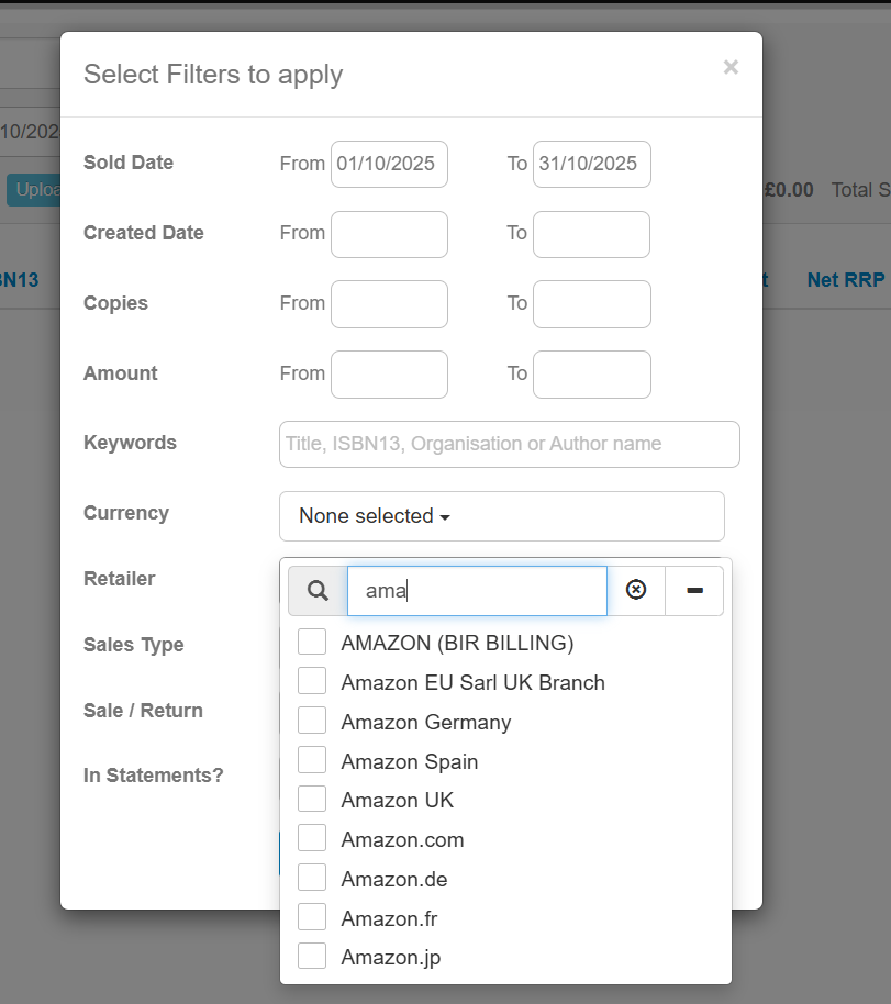 We have improved the Advanced Filters function by allowing you to search for a specific result in each field. For example, when opening the Retailer dropdown menu, you can now directly search for a retailer instead of scrolling through the list. This list will only populate once you have typed in three characters, which prevents loading problems for publishers that have a large amount of retailers logged within their system.