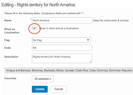 Within the Blurbs Tab of a title record, you have the option to store territory-specific descriptions. In order to do this, you need to navigate to General > Territory Admin and add the territory to your system. Once you have done this, ensure the Show as localisation box is checked on your territory, as shown below: