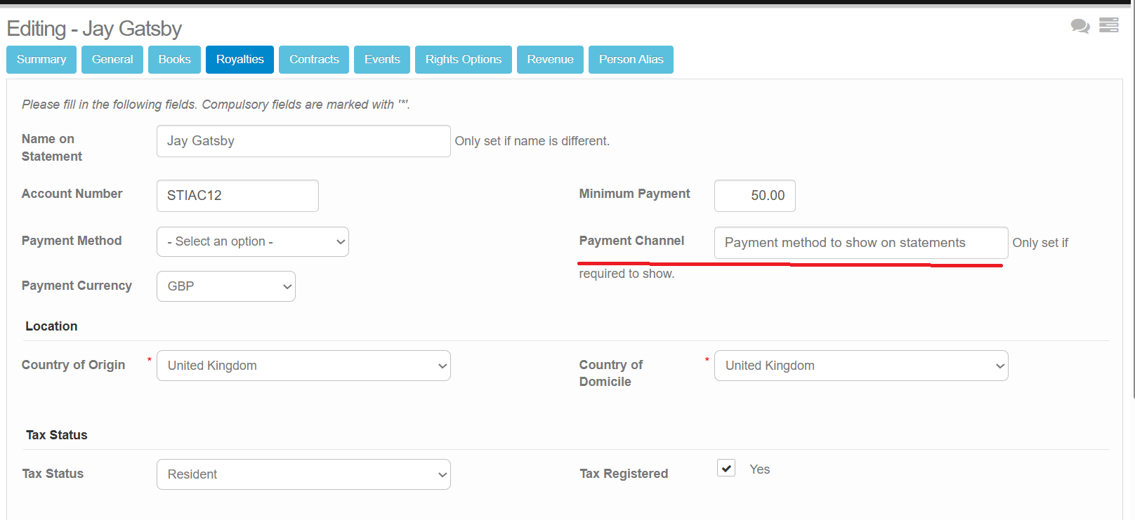 We have added a new Payment Channel field to this tab. This is a free text field that can be used to indicate to the payee how they will get paid their royalties. What you type here also shows on royalty statements generated, so please only use this field if you are happy with the data entered being displayed on your royalty statements.